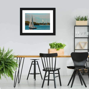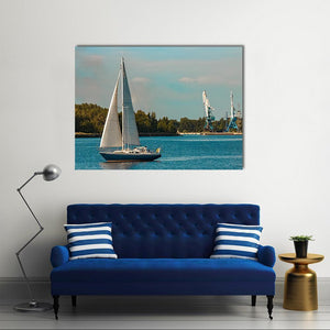 Blue Sailboat In Travel presents a realistic sailboat with white sails and a blue hull resting in a calm harbor beside tall cranes and foliage. The blue, white, green, and gray palette gives the scene a serene yet slightly industrial mood and works well in modern homes or home offices.