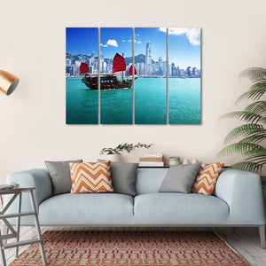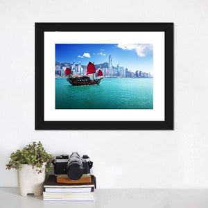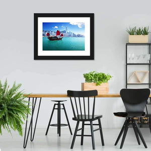 Capture the allure of Hong Kong's skyline with this vibrant canvas art. Featuring a traditional junk boat sailing against modern skyscrapers under a bright blue sky, it brings a serene yet dynamic energy to any space.