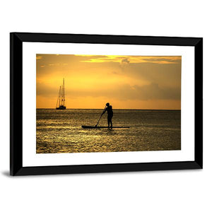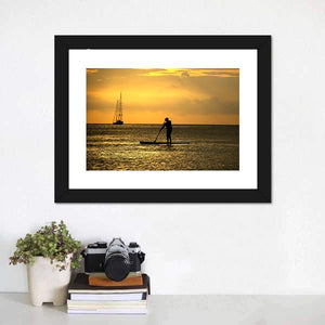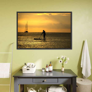 A silhouetted paddleboarder and sailboat glide across a golden-hour ocean, rendered in warm orange and yellow tones with deep blue contrasts. This modern landscape print carries a serene, peaceful mood and suits modern living spaces and home decor.