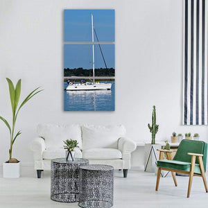 This realistic canvas shows a sailboat with a tall mast on calm water under a blue sky, with distant trees creating a peaceful daytime scene. Its blue, white, green and brown palette and rule-of-thirds composition suit nature-inspired or sailing-themed rooms.