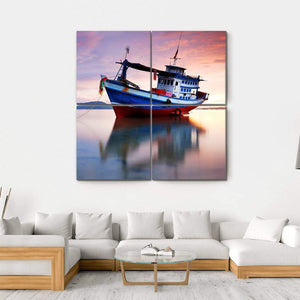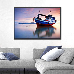This serene canvas features a fishing boat reflected in calm waters, surrounded by a colorful sunset sky. The blend of blues, purples, and oranges creates a tranquil atmosphere, making it an ideal addition to your home decor.