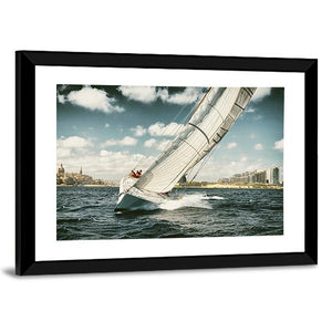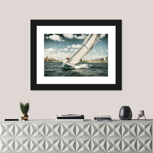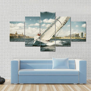 This canvas art features a photorealistic sailboat navigating a dynamic ocean scene, complete with crashing waves and a distant cityscape. Its serene palette of blue, white, grey, and brown brings an adventurous spirit to any space.