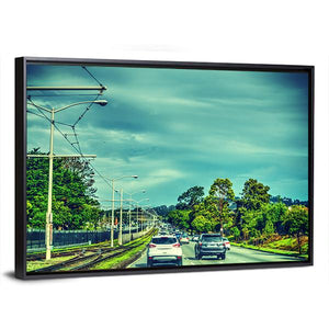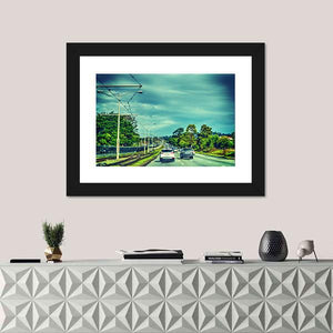 A realistic view of traffic on a cloudy day in San Francisco, showing a road with cars, trees and overhead power lines. The green, blue and gray palette and diagonal composition give depth and an urban, overcast driving mood; it suits modern living rooms or home offices.