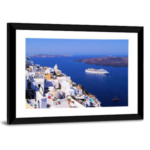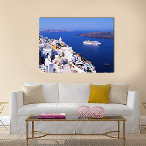 This canvas print captures the serene beauty of Fira in Santorini, featuring elegant white buildings against a backdrop of blue ocean and islands. The high-angle perspective and realistic details, including domed roofs and a distant cruise ship, evoke a peaceful vacation vibe.