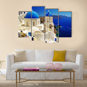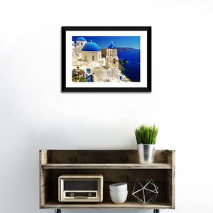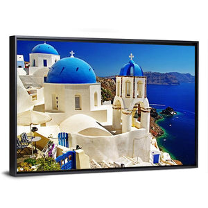 This beautiful canvas artwork features a tranquil scene of a Greek island village with iconic blue-domed churches and the serene Mediterranean Sea. Its photorealistic style captures the idyllic charm of Santorini, making it a captivating addition to any wall.