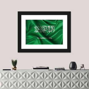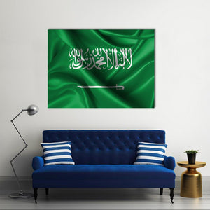 This canvas art features the wavy flag of Saudi Arabia, enhanced by Arabic calligraphy and a sword. Bold and symbolic, it captures the richness of Saudi culture with its green and white palette.