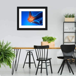 Elbow anatomy shown as a close-up medical illustration, with bones, muscles and glowing orange highlights that indicate pain in the joint. The 3D-rendered image uses blue, orange, white, and red for a clinical, informative mood and works well in a clinic, science classroom, or modern home study.