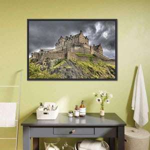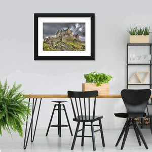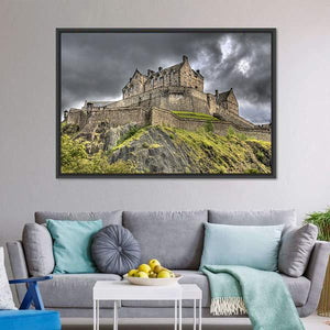 A panoramic view of Edinburgh Castle on a grass-covered hill, captured under a stormy sky with stone ramparts and weathered buildings. The image carries a dramatic, historic, and foreboding mood that suits modern and classic interiors. Its wide-angle, low-angle composition and muted gray, brown, green, and black palette draw attention to place and atmosphere.