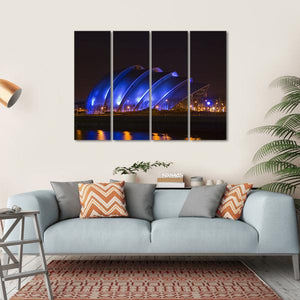 This striking canvas art captures the modern architecture of the Glasgow Armadillo Building, beautifully reflecting the river and lights at night. With its vibrant palette of blue, black, yellow, and white, it adds a bold touch to any wall.