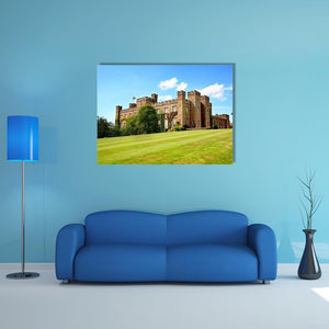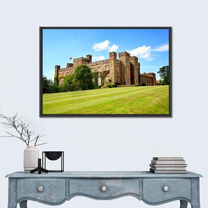 Scone Palace in Scotland sits on a striped grassy hill, its stone turrets and flag set against a clear blue sky. Rendered in a realistic landscape style with greens, blues and browns, the print feels grand, sunny, and serene and works well in classic or modern home interiors.