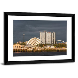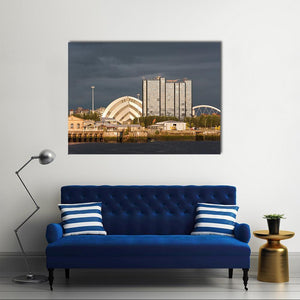 This striking canvas art captures the dramatic interaction of sunlight and storm clouds over modern buildings along a serene riverfront. The blending blues, grays, and touches of gold evoke an urban elegance, making it a captivating addition to your wall decor.