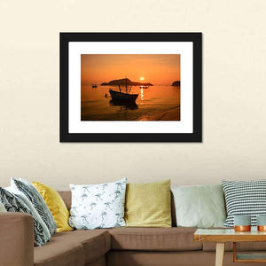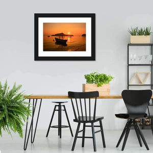 A panoramic, photorealistic canvas showing a long tail boat at sunset over calm ocean waters, with silhouetted islands and the sun reflecting on the sea. Warm orange and yellow tones mixed with blue and brown create a serene, tranquil mood that works well in beach-inspired or modern rooms.