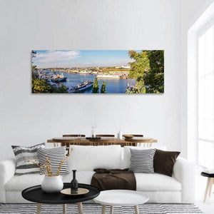Marina Seascape Russia Panoramic Canvas captures a daytime harbor with multiple ships docked, buildings along the distant shore, and lush green trees in the foreground. The photographic, realistic scene feels serene, bright and calm, using blue, green, white and brown tones. It suits modern or coastal-style rooms as a panoramic focal piece.