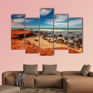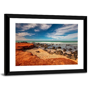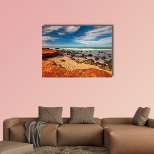 Red Dirt At Baby Beach captures a rocky beach with red rock formations, smooth water, ocean and cloud-filled sky. The realistic landscape carries a serene, natural mood with blues, browns, tans and greens. It works well in nature-inspired or coastal room decor and modern homes.