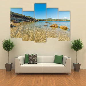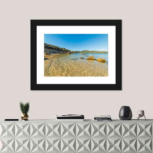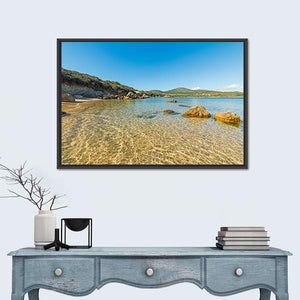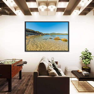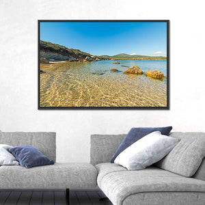 Photographic canvas of a small cove in Alghero, showing sand, rocky shoreline and clear blue water. The eye-level composition and bright daytime light give a serene, peaceful, natural feel with gentle hills on the horizon. Suits coastal or modern room decor.