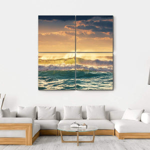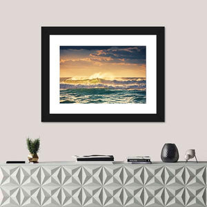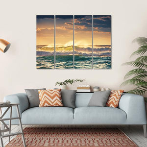 Capture the serene beauty of the ocean with this stunning canvas wall art featuring vibrant waves and a breathtaking sunset. The sunlight breaking through the waves and dramatic cloud formations create a lively atmosphere, perfect for adding a natural touch to any space.