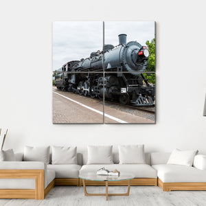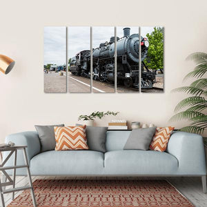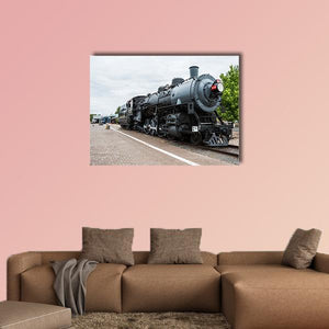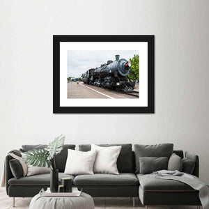 This vintage canvas features a powerful steam locomotive captured in a nostalgic scene. Rendered in shades of grey and black against a cloudy sky, it brings a historic touch to any wall.