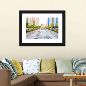 This canvas art captures the vibrant scene of Cheonggyecheon Stream in Seoul, showcasing a lively city canal lined with trees and tall buildings. The urban atmosphere is enhanced by flowing water and the presence of people, adding life to your space.