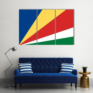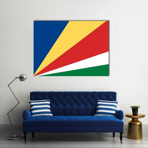 Flag of Seychelles Canvas Wall Art presents the national flag as a modern, geometric abstract. Five diagonal bands of blue, yellow, red, white and green radiate from the bottom-left corner, creating a vibrant, graphic look that fits contemporary living rooms or home offices.