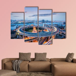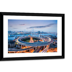 A modern cityscape centered on Nanpu Bridge at dusk, viewed from above with winding highway interchanges and streaking vehicle lights. Cool blues and warm oranges give an energetic, nocturnal mood that fits contemporary living rooms or offices looking for bold urban wall art.