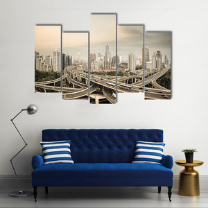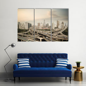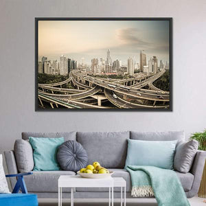 This canvas features a striking city skyline over a busy highway interchange in Shanghai. With its modern look and sprawling urban scene, it captures the vastness of city life, showcasing cars and buses in motion against a refined palette of grey, beige, and white.