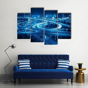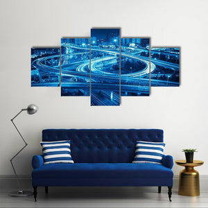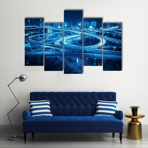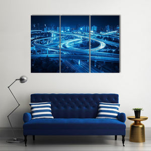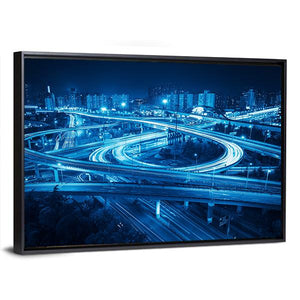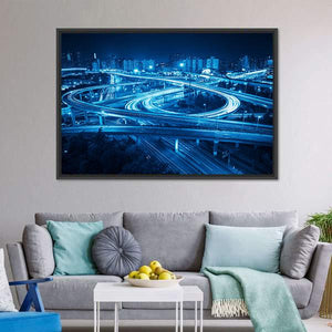 This canvas wall art captures a dynamic highway interchange in Shanghai, illuminated by glowing light trails and the city's skyline at night. The vibrant blue and black palette creates a modern and energetic atmosphere, ideal for enhancing your living space.