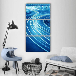 Light Trails In Shanghai shows long-exposure light trails sweeping along a road in Shanghai, rendered in a blue, white, and black palette. This abstract, modern photo uses leading lines and depth to create a dynamic, energetic sense of motion. It works well with modern room decor like contemporary living rooms or offices.