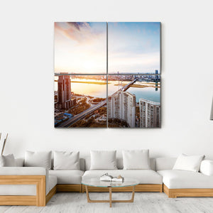 This canvas features a serene cityscape of Shanghai, showcasing the stunning skyline and intricate bridges at sunset. The rich blue and orange hues reflect beautifully on the river, creating a calm and urban atmosphere.