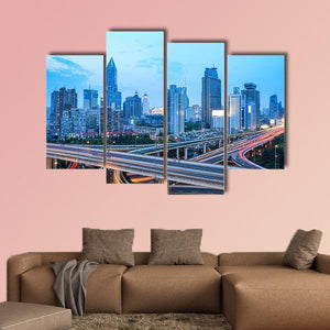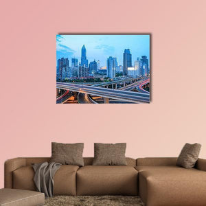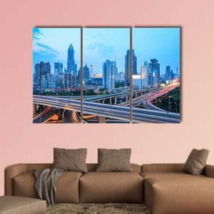 Aerial cityscape of the Shanghai skyline and a looping highway lit by car light trails at dusk. The blue, gray, and orange palette gives the scene a vibrant, urban energy that fits modern living rooms or office walls.