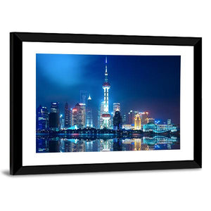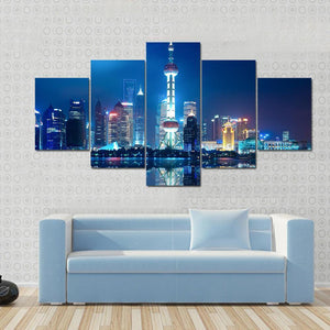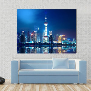 This canvas wall art features a vibrant view of the Shanghai skyline at night, showcasing iconic skyscrapers such as the Oriental Pearl Tower. The composition captures a beautiful symmetrical reflection on the water, set in a palette of blue, yellow, and white.