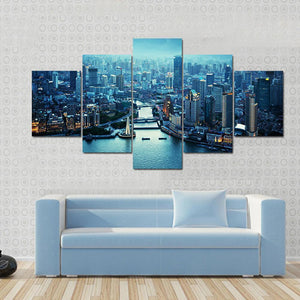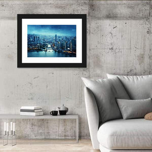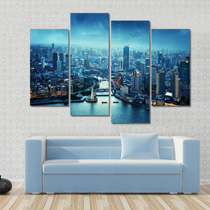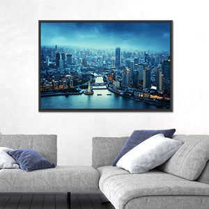 This canvas wall art captures the dynamic skyline of Shanghai at sunset, showcasing a lively urban scene with illuminated buildings, a flowing river, and dark clouds. The cool blue and teal palette adds a modern touch to your wall decor.