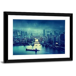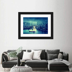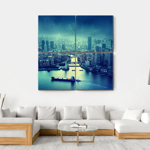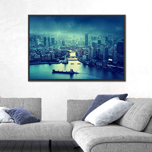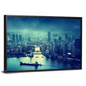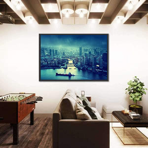 This captivating canvas art features the skyline of Shanghai, showcasing a dramatic cityscape where a ship navigates the river amid dense urban development. The atmospheric palette of blues and teals evokes a moody, cinematic feel, making it an striking addition to your wall decor.