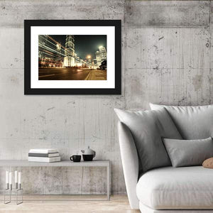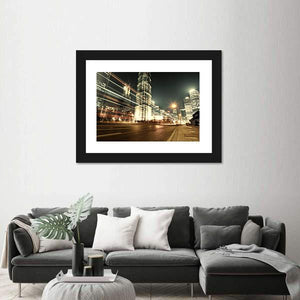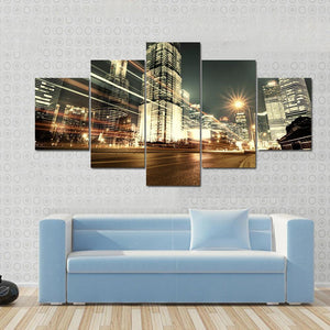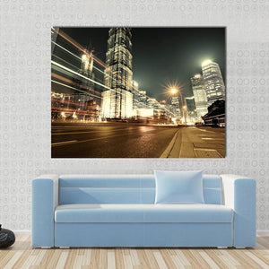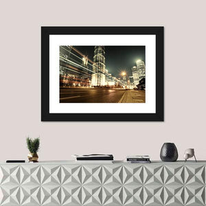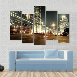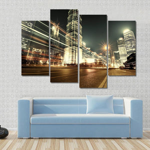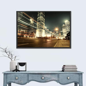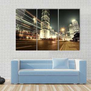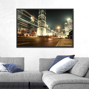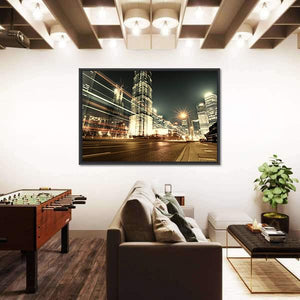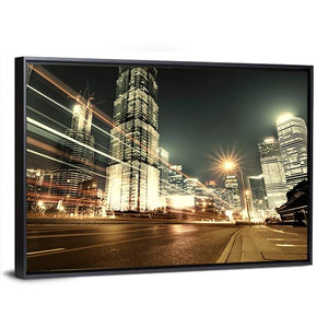 This striking canvas showcases Shanghai's breathtaking skyline at night, featuring dynamic skyscrapers and vibrant city lights. The energetic scene, highlighted by light streaks from moving vehicles, captures the essence of urban life.