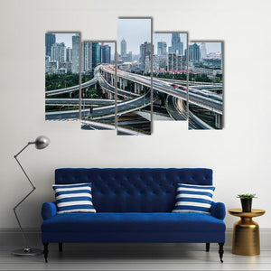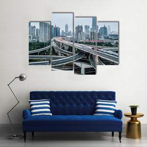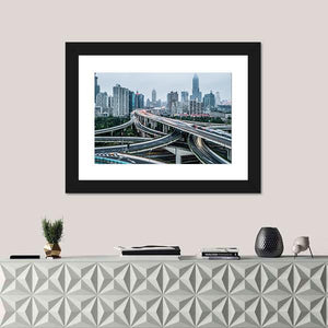 This captivating cityscape captures the dynamic freeway interchange of Shanghai at night, showcasing bustling traffic and towering skyscrapers. Its modern, photorealistic style enhances any urban-inspired décor.
