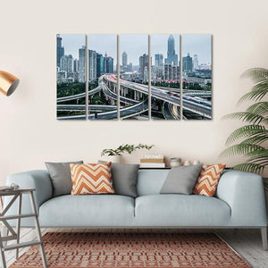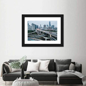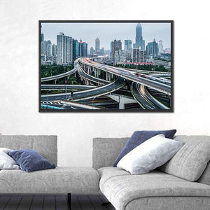This captivating canvas art showcases the vibrant chaos of Shanghai's city skyline, highlighting an intricate interstate highway interchange. The cityscape's overhead perspective features tall skyscrapers and dynamic light trails from cars, creating a mood of urban dynamism and modernity.