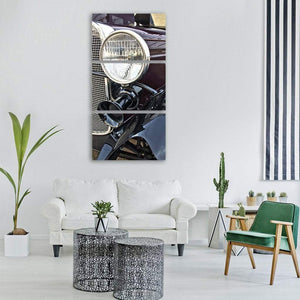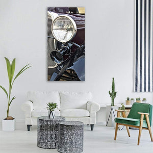 Close-up of an antique car’s headlight, grille and horn with a nostalgic, vintage mood. The silver, black, maroon and white palette and a detailed reflection in the headlight give the piece a retro automotive character. Works well in vintage or automotive-themed rooms and retro decor.