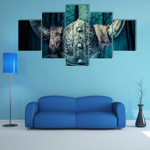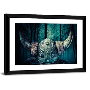 A centered fantasy digital portrait of a Viking warrior in a fur-trimmed, horned helmet with an intricate, glowing design set against a dark forest. Cool blues, teals, greys and brown tones give it a mysterious, intimidating, epic mood that suits modern home decor.