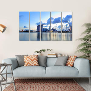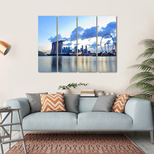 This canvas features the stunning skyline of Marina Bay, showcasing iconic skyscrapers against the serene waterfront and vibrant gardens. With its calming palette of blue, white, grey, and yellow, it adds a touch of modern elegance to any space.