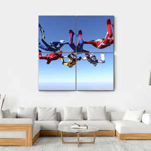 This canvas art captures a thrilling moment with a dynamic group of skydivers in colorful suits, soaring through the blue sky. The exciting atmosphere evokes a sense of freedom and adventure, making it a perfect addition to any sports enthusiast's decor.