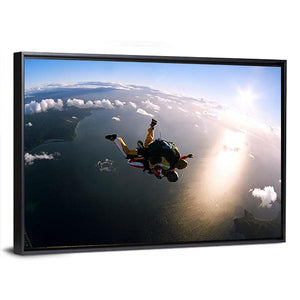 Skydivers In Action Panoramic Canvas shows tandem skydivers above the ocean and clouds, with a sun flare that emphasizes motion and height. The modern, panoramic image blends adventurous energy with calm coastal tones—blue, white and warm highlights—making it a strong focal piece for modern living rooms, offices, or sport-themed spaces.