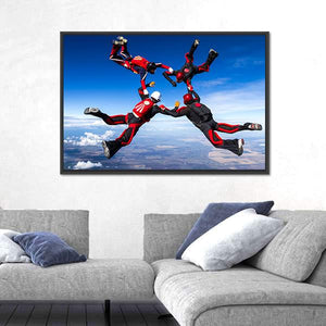 This canvas features four skydivers in formation against a clear blue sky, capturing a dynamic sense of motion. The exciting composition evokes feelings of adventure and freedom, making it a vibrant addition to any space.