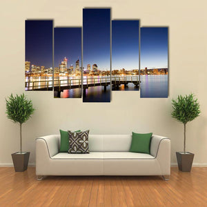 Perth City & River captures a nighttime waterfront scene with a wooden pier leading toward the lit city skyline. Cool blues and warm yellow highlights create a serene, reflective yet vibrant urban mood. It suits modern living rooms and homes that favor realistic cityscape art.