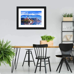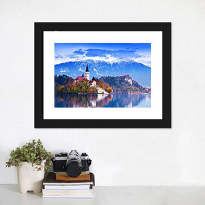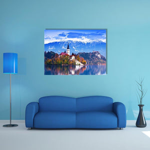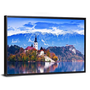 This canvas wall art captures the serene beauty of Lake Bled in Slovenia, featuring a picturesque island church surrounded by vibrant autumn trees and majestic mountains. With its stunning palette of blues and earth tones, it's perfect for adding a peaceful touch to any space.