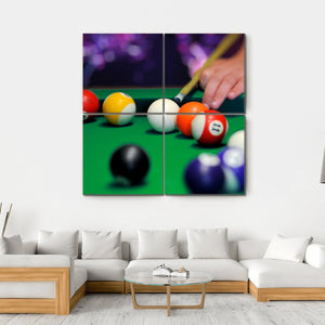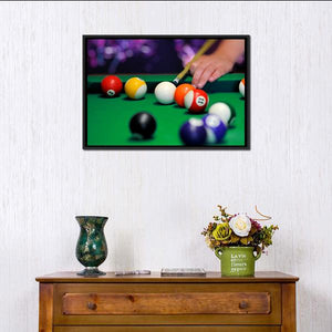 Capture the excitement of a pool game with this vibrant canvas featuring a green pool table, colorful billiard balls, and a hand expertly holding a cue stick. The close-up view immerses you in the focused action of the game, making it a lively addition to any space.