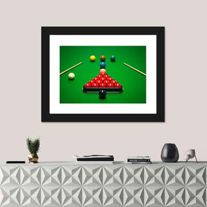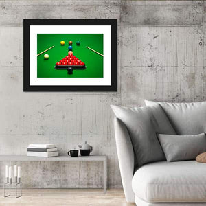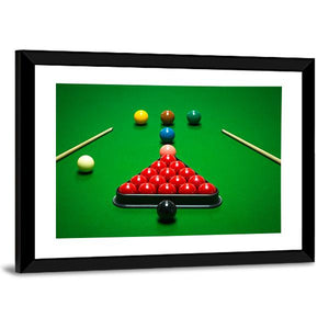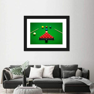 This canvas wall art features a close-up view of snooker balls arranged in a striking triangle on a vibrant green table. With a clean and focused mood, it captures the essence of the game, making it a perfect addition to any sports lover's space.