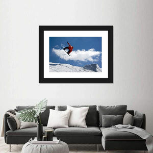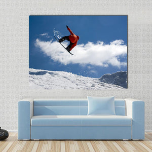 This dynamic canvas features a snowboarder mid-air above a snowy mountain, exuding an adventurous spirit. The vibrant blue sky and spray of snow create an exciting atmosphere, perfect for any space.