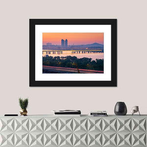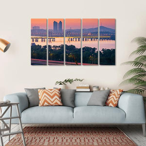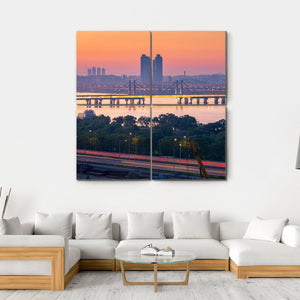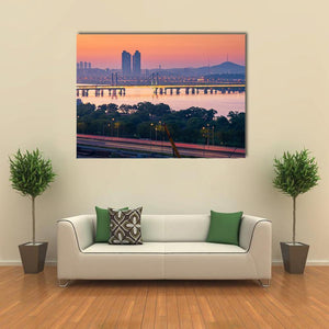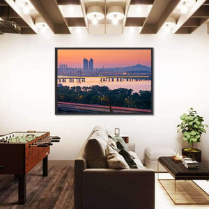 This vibrant canvas art captures the serene beauty of Seoul's skyline at sunset, featuring tall buildings and a graceful suspension bridge. The tranquil scene, adorned with colors of orange, blue, and green, adds a modern touch to any room.