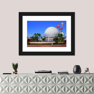 This bright and cheerful canvas art features the iconic Spaceship Earth structure alongside palm trees and a vibrant fountain. It adds a modern touch to any room with its photorealistic style and bold color palette of blue, green, white, and red.