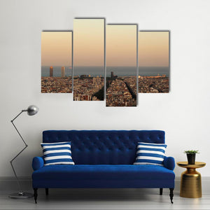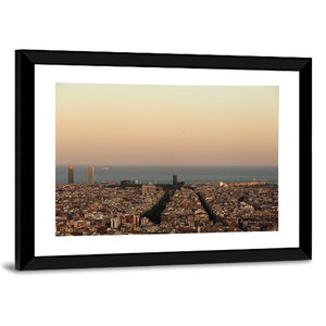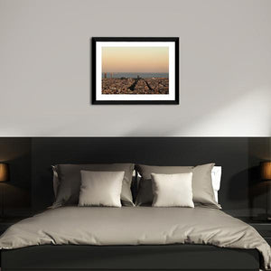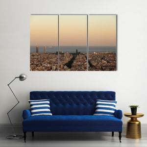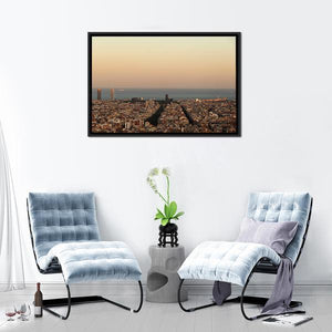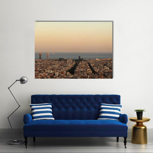 This cityscape canvas captures a serene aerial perspective of Barcelona, showcasing its skyline, ocean, and impressive buildings. The calming palette of orange, blue, brown, and beige invites a vast, urban vibe into your space.