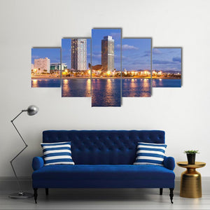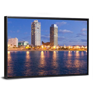 This canvas wall art captures the vibrant skyline of Barcelona, showcasing its stunning skyscrapers along the waterfront. The modern composition in shades of blue, white, and gold evokes an energetic atmosphere, making it a striking piece for any room.